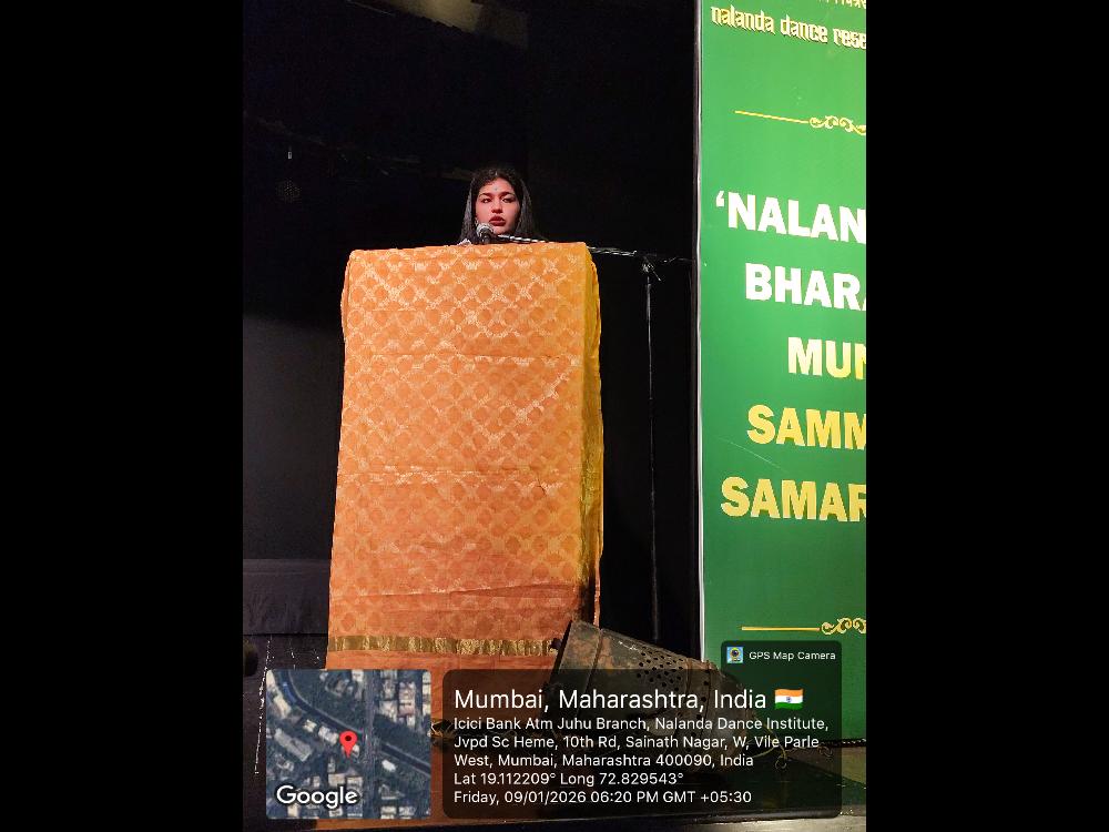 Nalanda’s Nrityotsav 2026 was held on Friday, 9th January 2026, at the prestigious Kanak Sabha of the Nalanda Dance Research Centre from 6:00 p.m. to 8:00 p.m. The evening commenced with the auspicious lighting of the lamp, marking a sacred beginning to the festival. This was followed by inspiring guidance and blessings from Dr. Smt. Uma Rele Ma’am, whose words set a profound and thoughtful tone for the performances that followed.