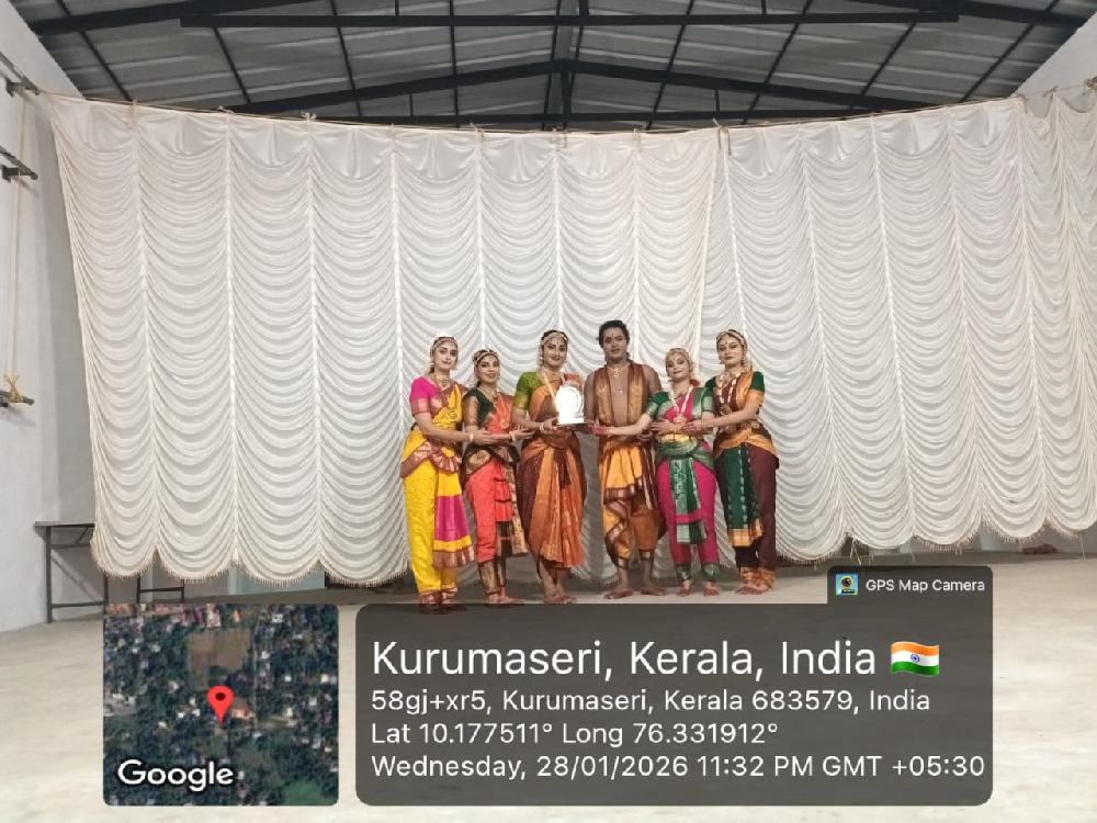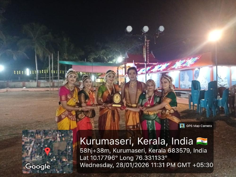 The Master part 1 Students of Nalanda Nritya Kala Mahavidyalaya performed at Kurumassery Bala Murugan temple in Kerala, on 28th January 2026 showcasing a Bharatanatyam recital. The presentation was conducted under the expert guidance and mentorship of Dr. Smt. Uma Rele, whose training and artistic vision were evident in the students’ disciplined execution and expressive quality.